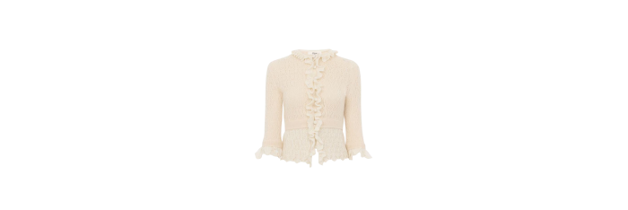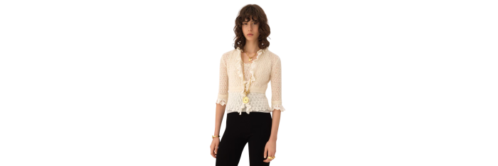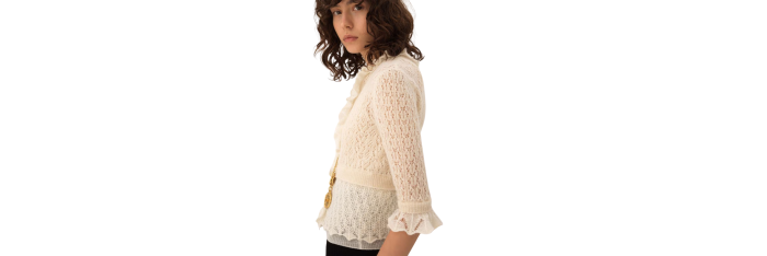 Pull court effet superposé en maille pointelle d’alpaga, mohair et soie mélangés, avec détails de volants, manches coude et boutons recouverts.