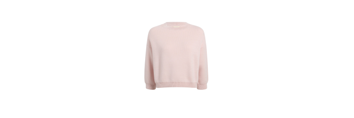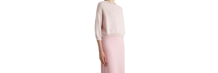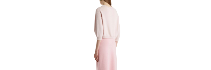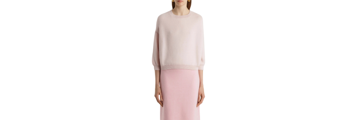 Un pull à coutures milanaises conçu pour mettre en valeur la douceur et la structure d'un mélange aérien et moelleux de cachemire et de mohair. Les coutures d'épaules tombantes accentuent la silhouette unique et volontairement arrondie. Finitions côtelées au col rond large, aux manches trois-quarts et à l'ourlet.