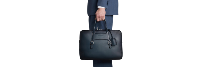 Ce sac de travail Santoni e est confectionné en cuir rehaussé de velature colorées, une finition artisanale qui crée un élégant effet dégradé. Compact et fonctionnel, il possède deux compartiments intérieurs et des poches zippées pratiques. Ses anses rembourrées sont agrémentées d’un détail central évoquant les lignes de la double boucle iconique. Cet accessoire dispose d’une bandoulière amovible pour le porter croisé ou à l’épaule.