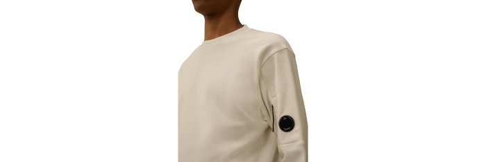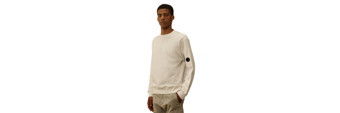 Sweat rasé du cou confectionné en polaire à relief diagonal, un coton brossé à tissage diagonal de poids moyen. Le tissu doux assure le confort et la facilité de mouvement. Le sweat-shirt est orné d'un logo brodé sur le col arrière, de la lentille emblématique de C.P. Company, et de poignets et d'un ourlet côtelés. Coupe régulière.