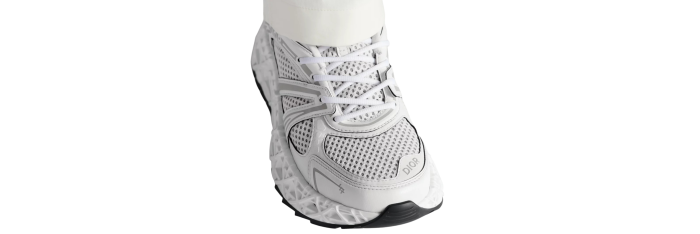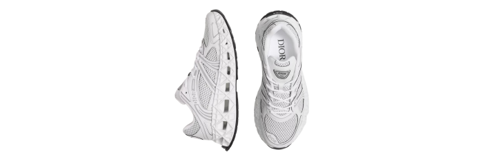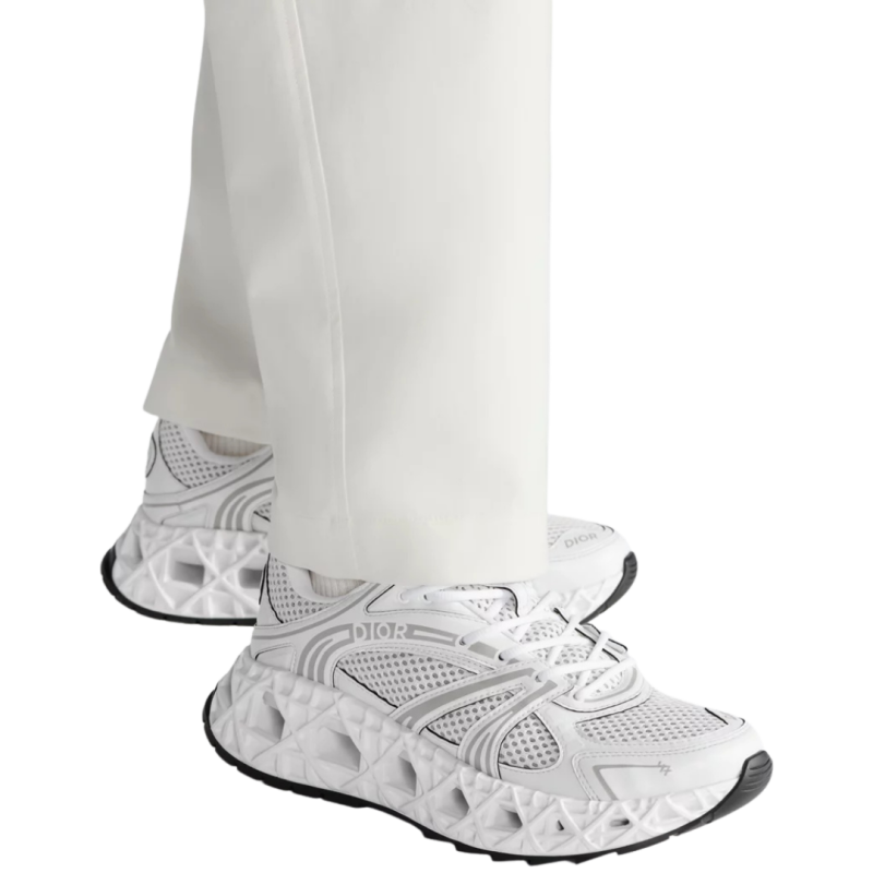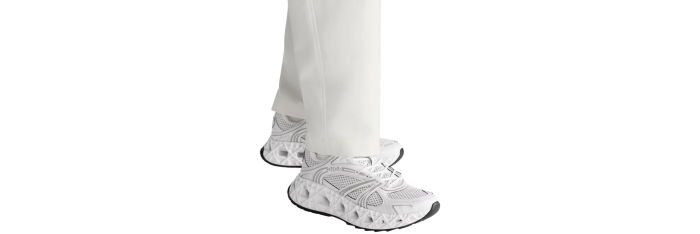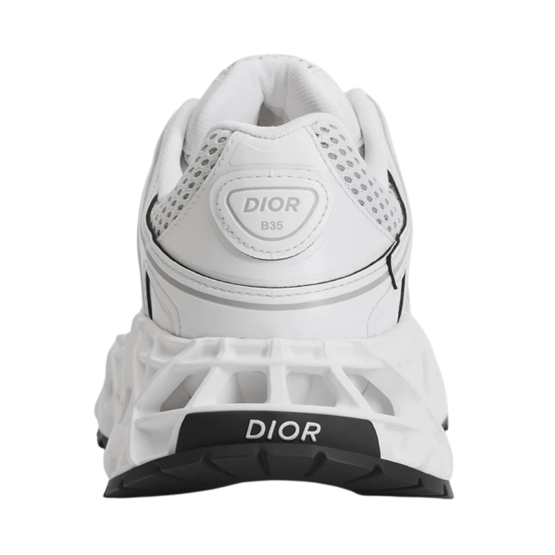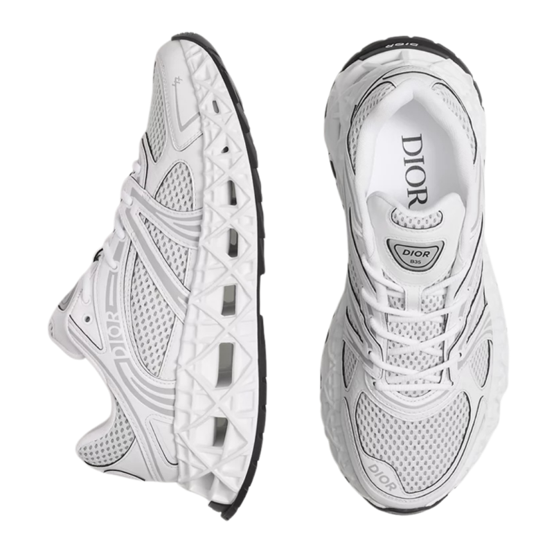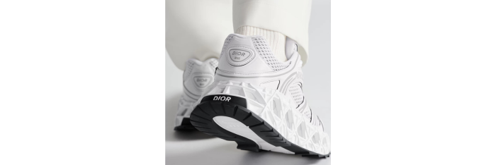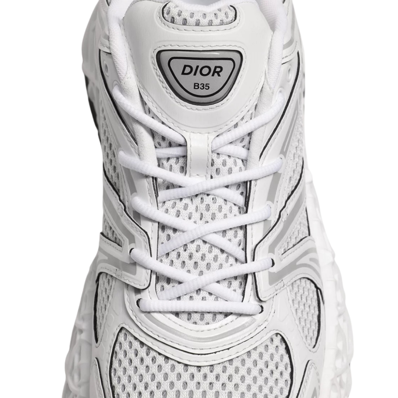 La sneaker B35 NXXT se distingue par son allure futuriste. Sa semelle architecturale ajourée à motif Cannage, témoigne des prouesses d'innovation de la Maison. Travaillée pour être à la fois légère tout en ayant un volume assumé, cette semelle offre une grande stabilité et une sensation de dynamisme à la silhouette. La tige blanche en tissu technique et maille technique bilayer apporte un contraste subtil inspiré d'une runner des années 90. Le travail de lignes graphiques et les signatures Dior et 47, réalisées à haute fréquence, accentuent son look moderne, tandis que les patchs Dior B35 sur la languette et le contrefort signent ce modèle d'exception. Cette sneaker vous garantira un confort et une stabilité optimum.