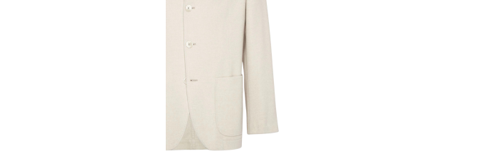 Revers crantés, poche poitrine plaquée, boutonnière sur le devant, manches longues, deux poches latérales plaquées, doublure en satin, sans fente arrière. Couleur : tons neutres. Matière : cachemire.