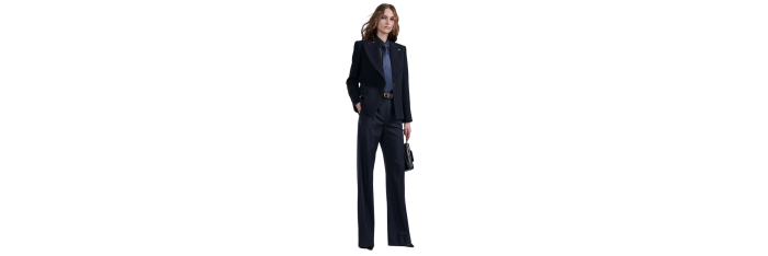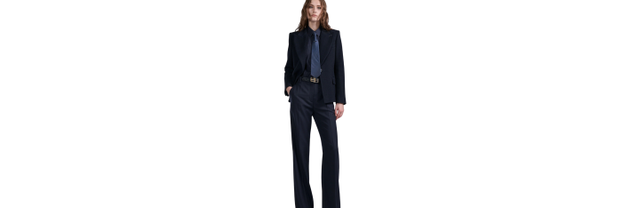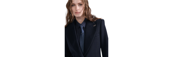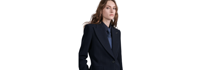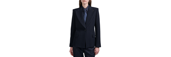 Proposée dans une coupe légèrement raccourcie à la carrure et taille marquées, cette veste de costume structure la silhouette. Elle est confectionnée dans un chevron texturé en laine et élasthane pour un porté chic et confortable. Son large col cranté aux accents 70’s présente un passant métallique amovible, nouveau détail des vestes de la saison. Au dos, vous retrouverez également notre piercing signature en métal argenté.