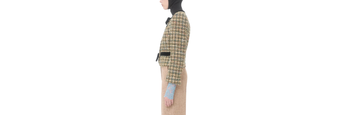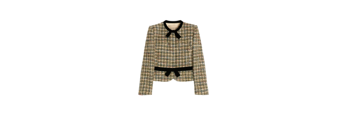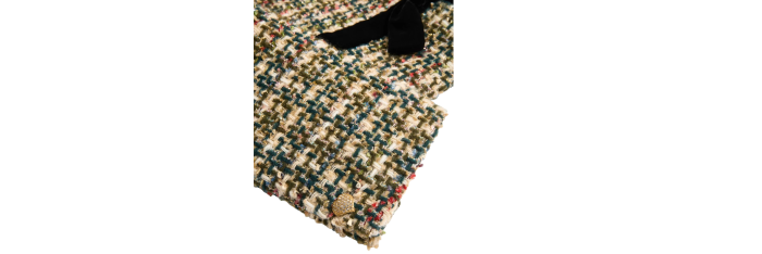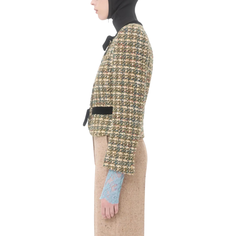 Veste courte col rond tweed multicolore vert doré nœud velours noir