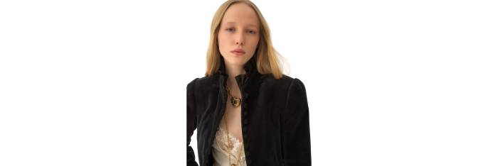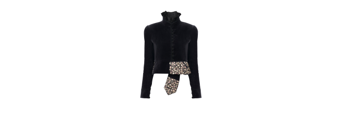 Veste spencer ajustée à col montant volanté en velours de coton souple, fermée par des boutons tissés et des passants. Une ceinture à broderies bijoux complète la pièce.