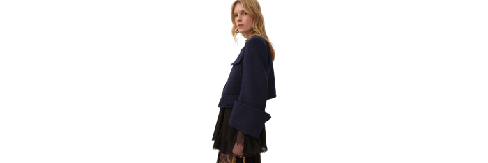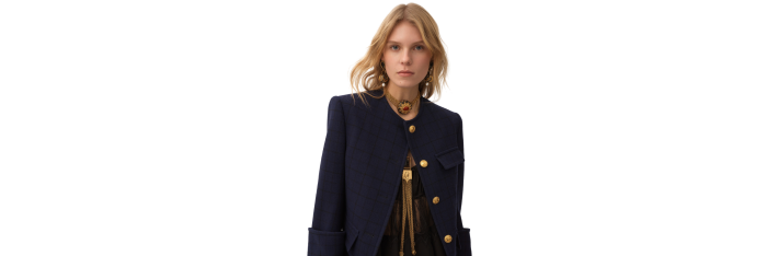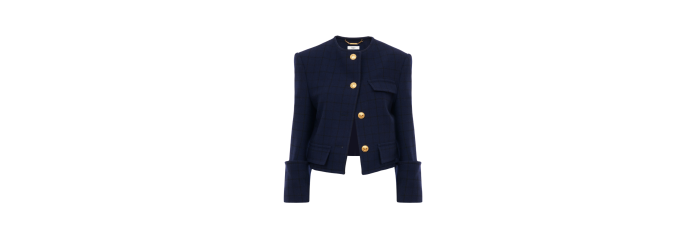 CHLOEVeste droite courte sans col laine carreaux bleu indigo boutons dorés