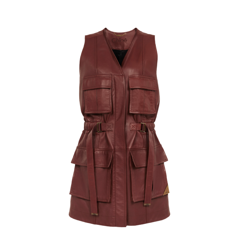 Veste sans manches utilitaire en cuir classique plongé, avec poches oversize à rabat, boutons en corne gravés et ceinture intégrée à boucles en métal doré. Un triangle en métal doré Chloé signe la poche gauche.