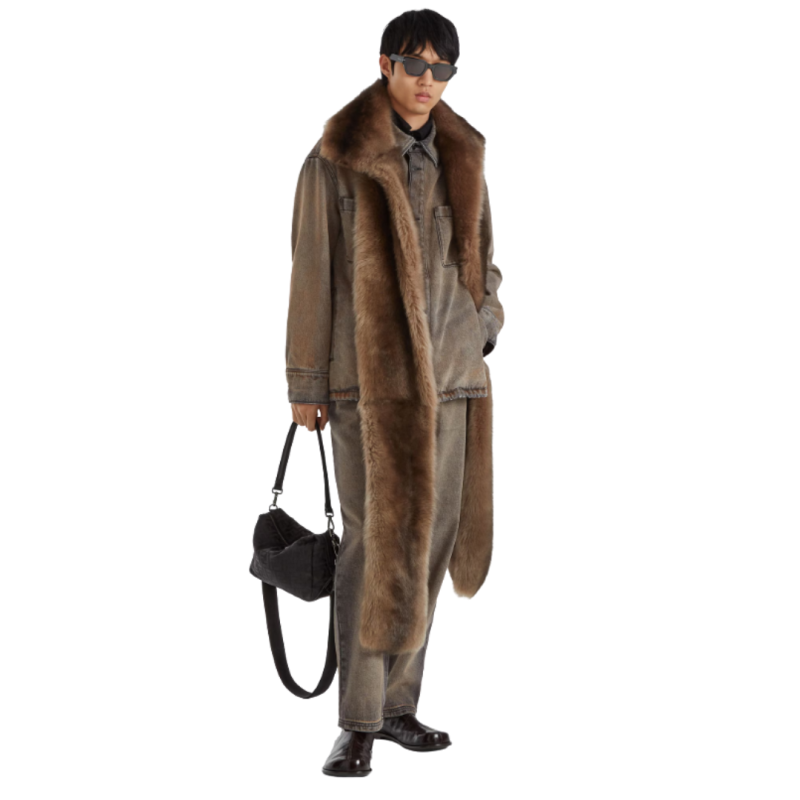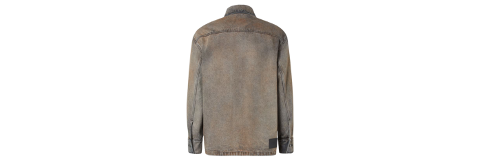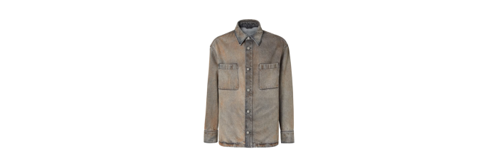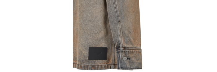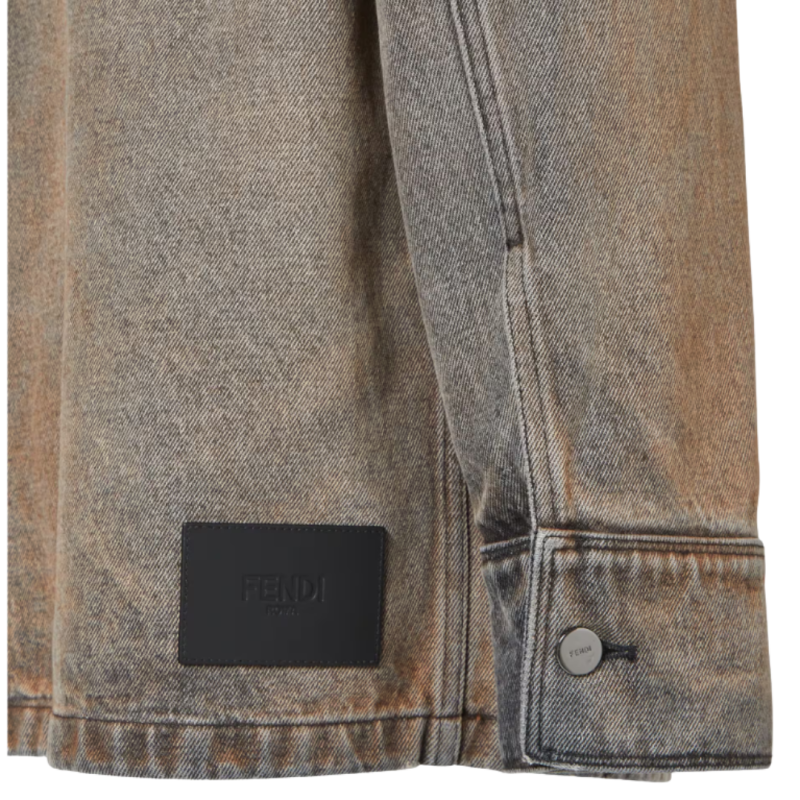 Chemise avec manches longues à épaule basse. Poches poitrine plaquées. Fermeture avec boutons logotypés en métal sur le devant. En tissu jean surteint de couleur grise. Écusson en cuir noir avec logo Fendi appliqué sur la poche gauche. Garnitures en métal finition palladium.