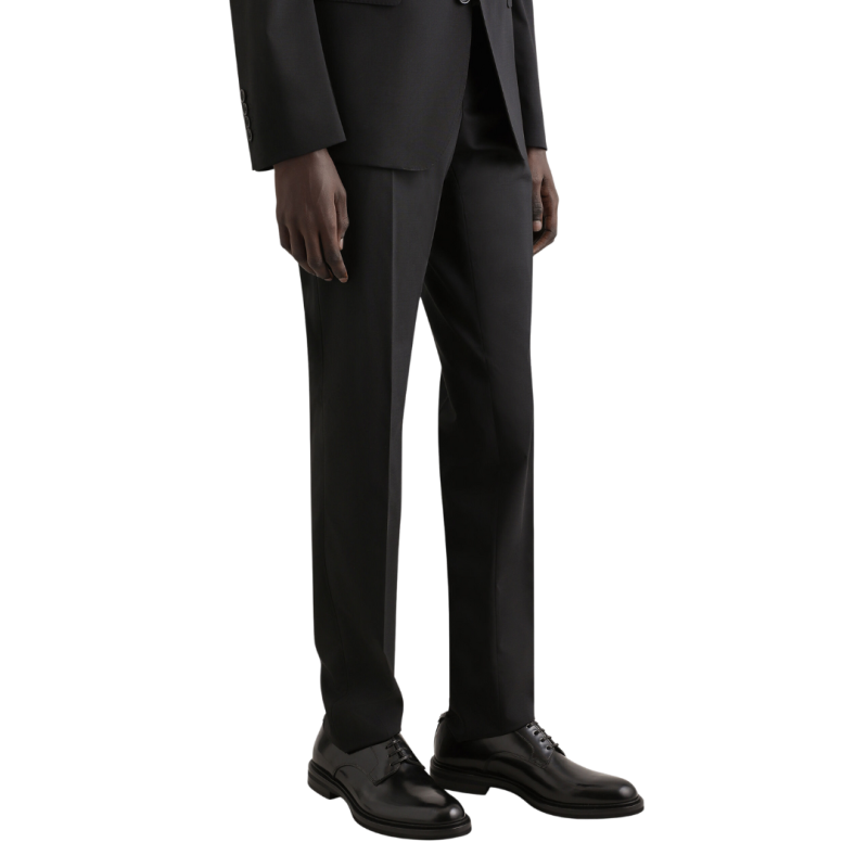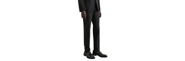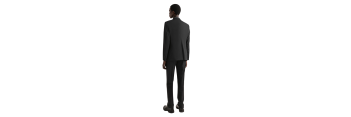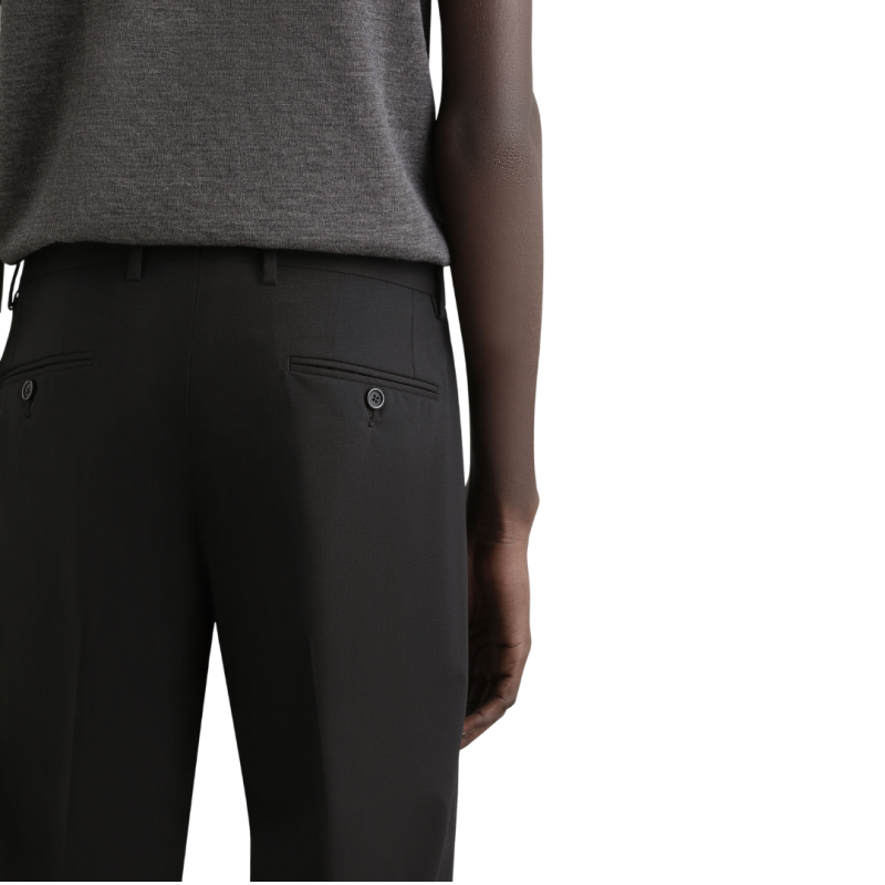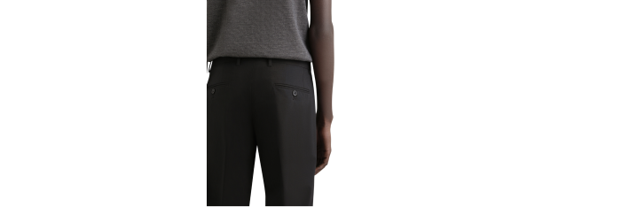 • Pantalon à poches italiennes et poches passepoilées boutonnées à l’arrière